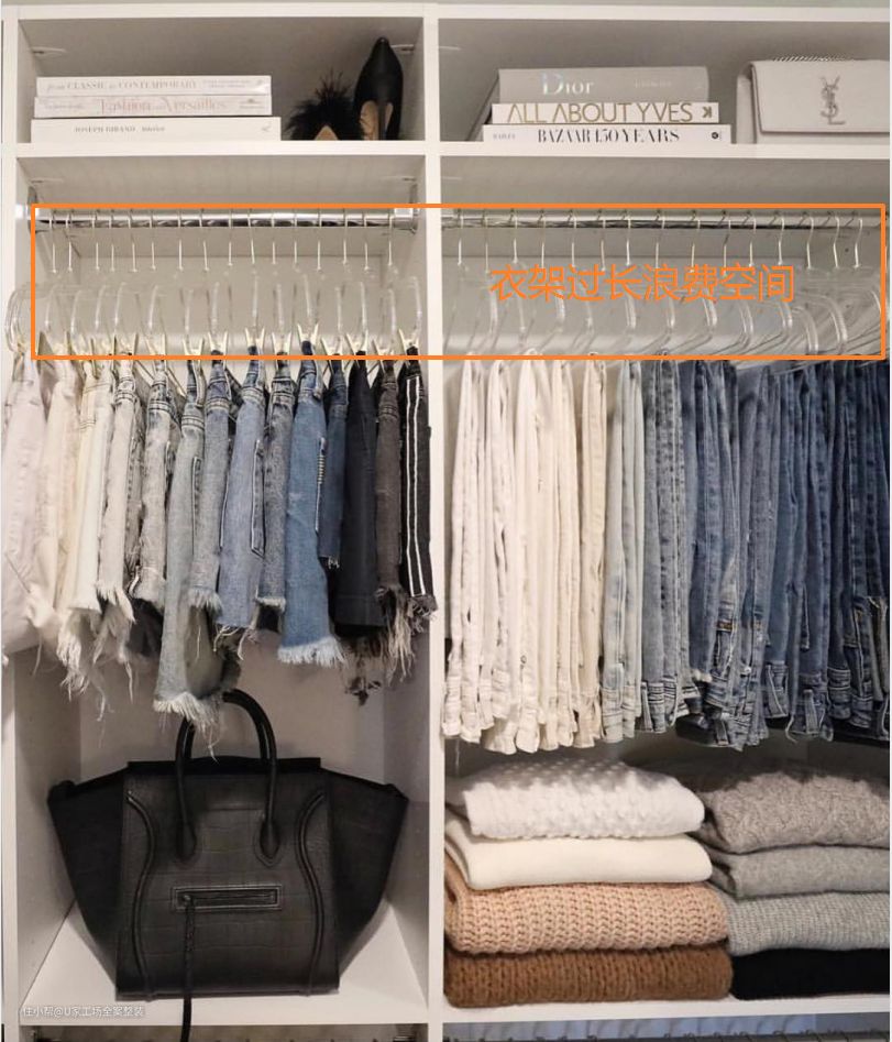 一层层的隔板把完整的衣柜空间分成一个又一个小空间,使用时拿一件带倒一大摞就是隔板收纳的最大问题,这样收纳衣服,空间利用率极低。