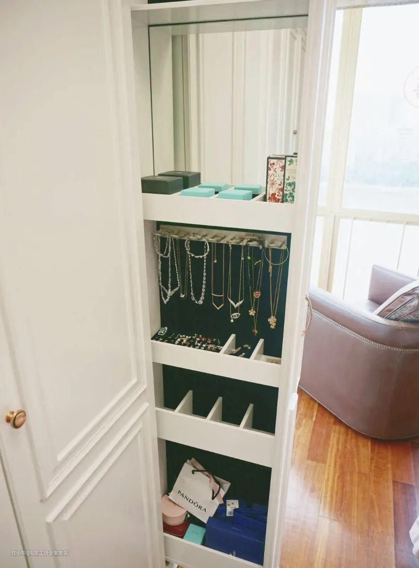 柜门可以采用移门或者平开门的方式,柜门上可以安装一大面镜子,选饰品佩戴时更加方便。