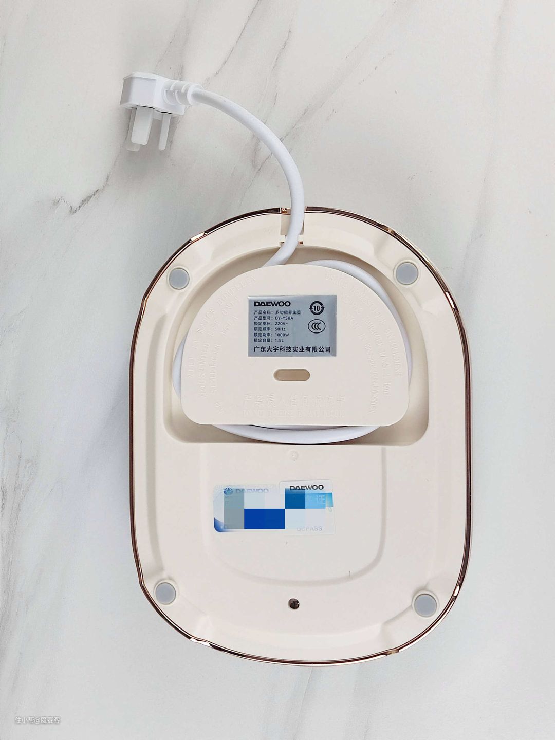 ▲它的底部有参数信息。而从底部线圈的做工可以感受到产品的安全性,另外,底部还有电线收纳设计,方便我们不使用养生壶时进行养生壶的整体收纳。