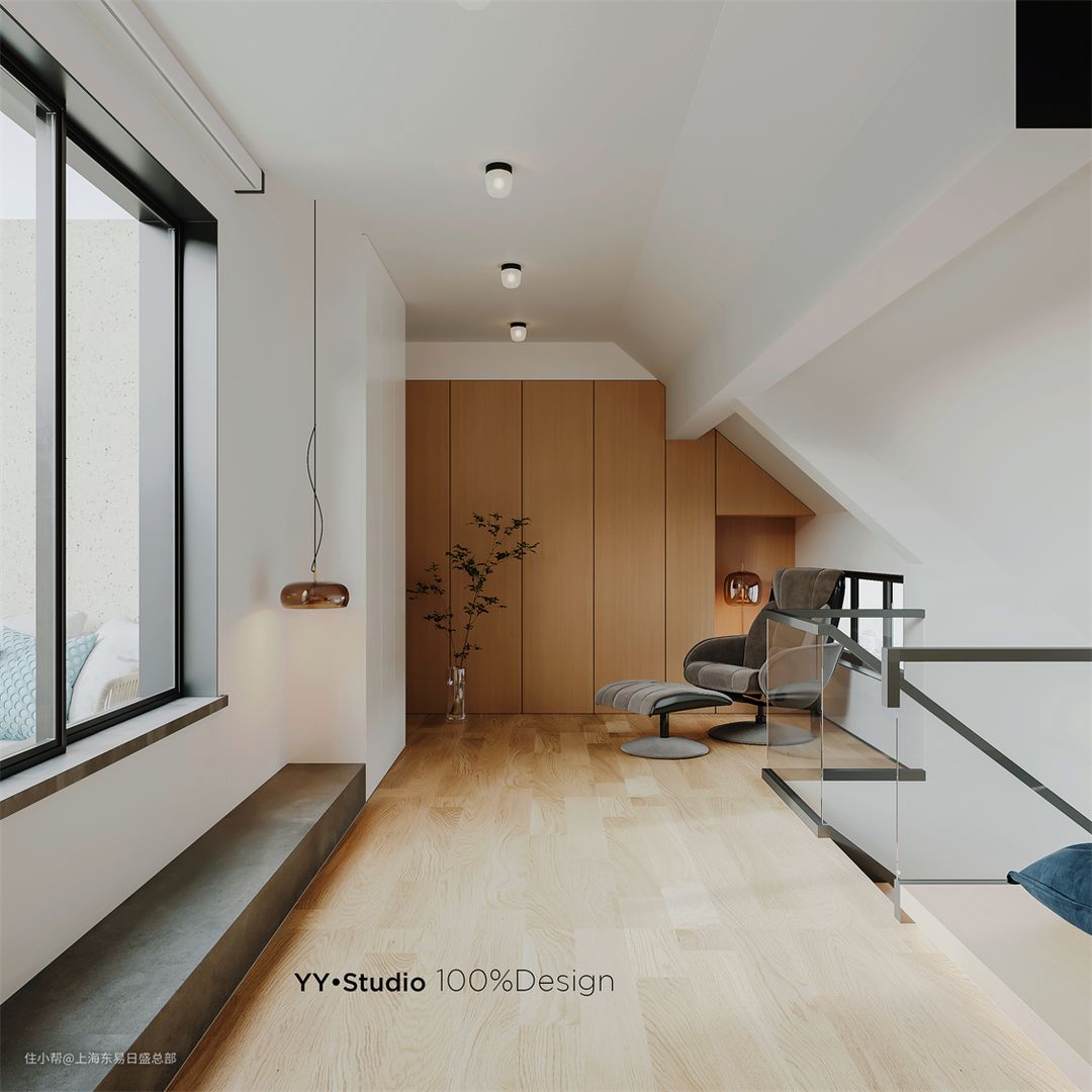 靠楼梯侧墙做了开放式书柜+悬挂式书桌的设计,空间敞亮通透,同时也能极大的提升空间利用率。斜面吊顶下方做木质地台,放置懒人沙发,打造专属休闲区域。