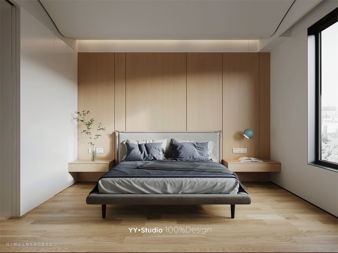 主卧延续了客厅原木色的主色调,背景墙使用原木色的护墙板,搭配利落的线条,营造简洁雅致的睡眠空间。对称设计的悬挂式床头柜,可以保证基本的储物需求,同时也呈现出舒适无压的视觉感受。