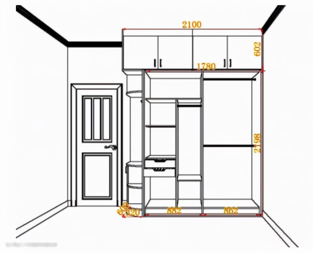 (6) 储物区衣柜高度,一般房间高度在2.7~2.8m之间,如果选择衣柜做到顶,超过2.4米的高度,最好分成上下两柜,下柜的高度一般是2.1m左右,其余的全归上柜。