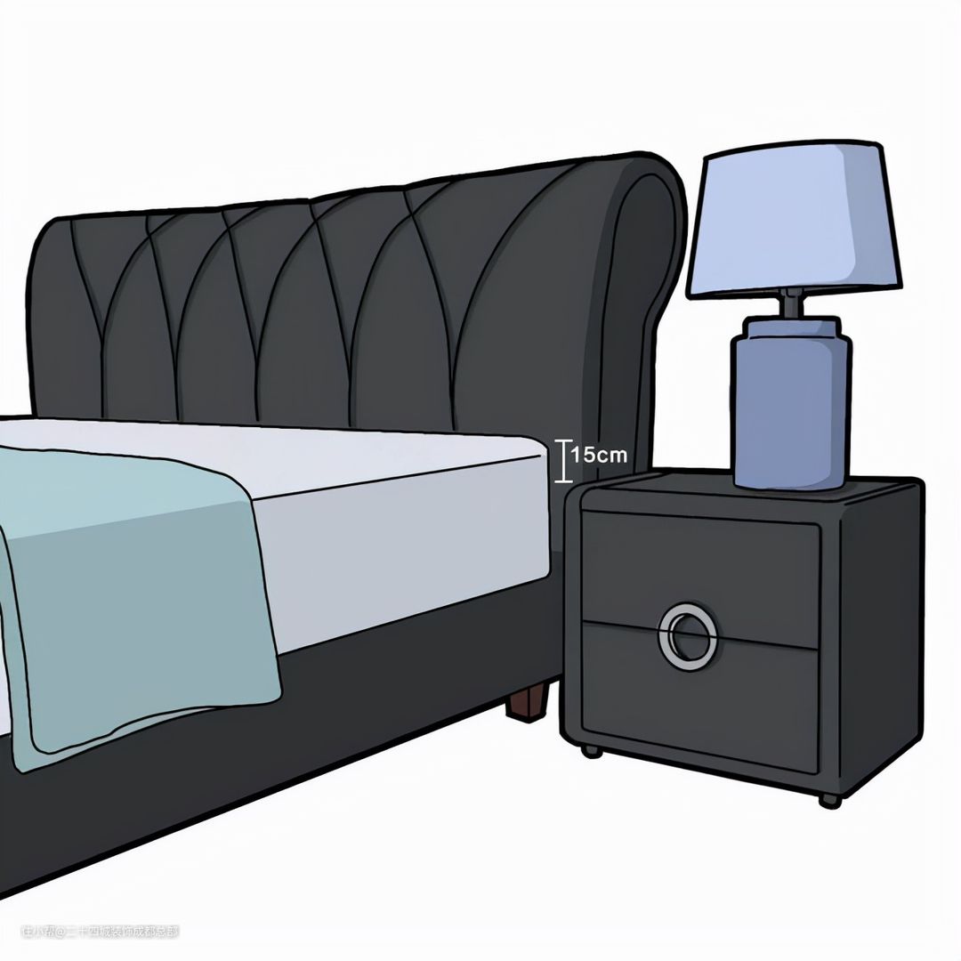 (3) 睡眠区床头柜的选择,如果房间面积过小,建议只要一个床头柜。如果房间面积足够,可以选择两个床头柜,能增加不少的收纳空间。其中床头柜与床垫顶端的高度一般是差不多的,但高或低15cm也是可以的。