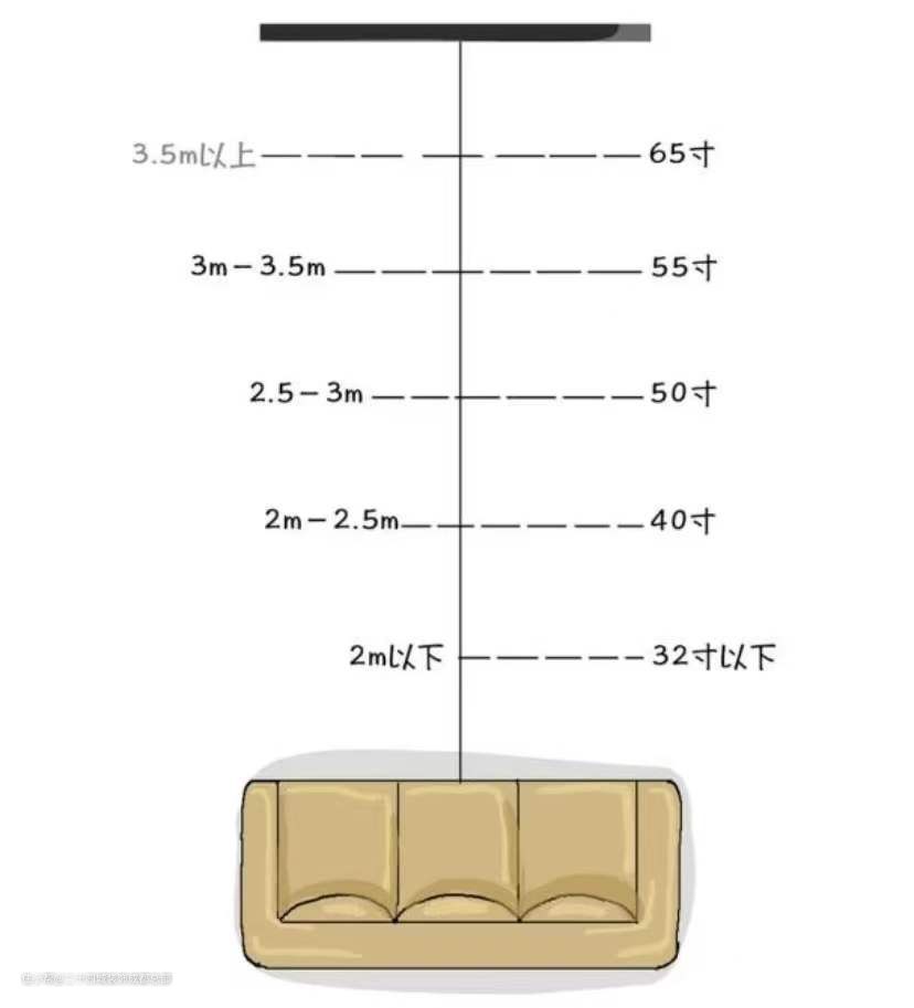 (4) 电视区,电视机大小与沙发之间的最佳尺寸关系:2m以下对应32英寸以下,2m-2.5m对应40英寸,2.5m-3m对应50英寸,3m-3.5m对应55英寸,3.5m以上对应65英寸。