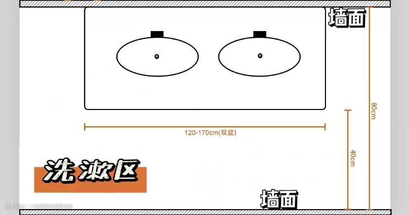 (1) 洗手区,台盆单盆宽度至少60cm,双盆宽度为120cm-170cm,高度80cm-85cm,镜柜顶端离地185cm-200cm是最舒服的。