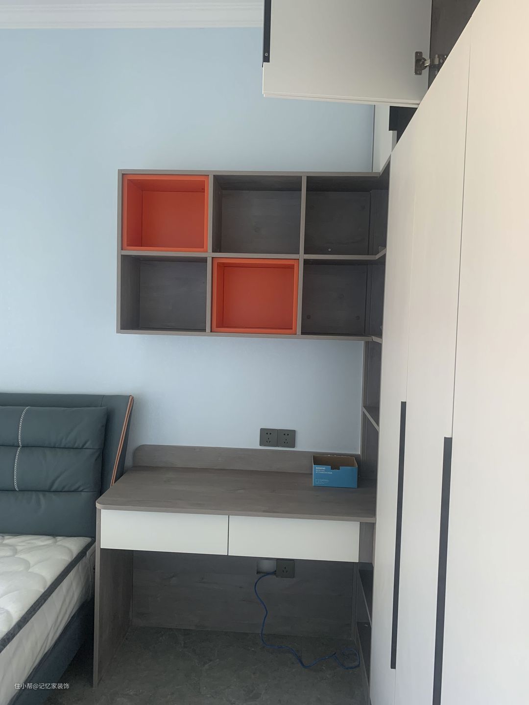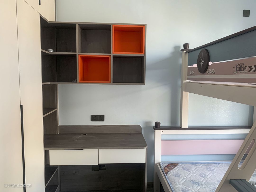 衣柜内嵌书桌是现在很多有孩子的家庭的选择,这样做既节省空间,有美观大气,你家如果也有学生当可以试试。上面的书柜增加一些色彩跳跃感,层次更丰富。