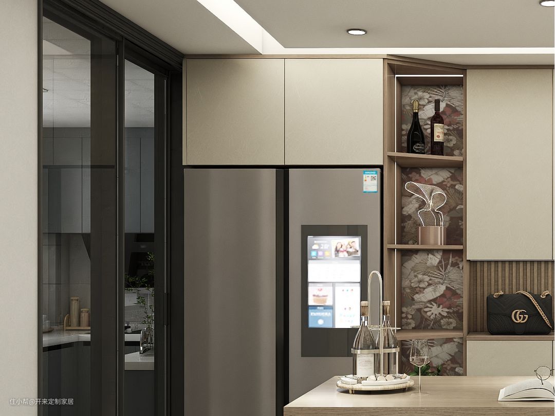 这一家就将厨房嵌入电器区独立出来与玄关柜合并,并开放式增设水槽型岛台柜~厨房油烟区即用通透玻璃门做隔断。