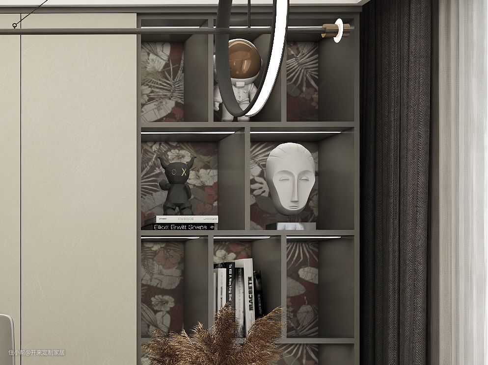 (见图8)一侧设计错落有序的开架与悬浮抽屉,开架与抽屉下留空都设计花园背板。