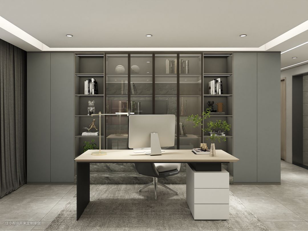 (见图4)开放式书房一字设计书柜收纳柜,两侧高柜搭配隐形拉手大气稳重