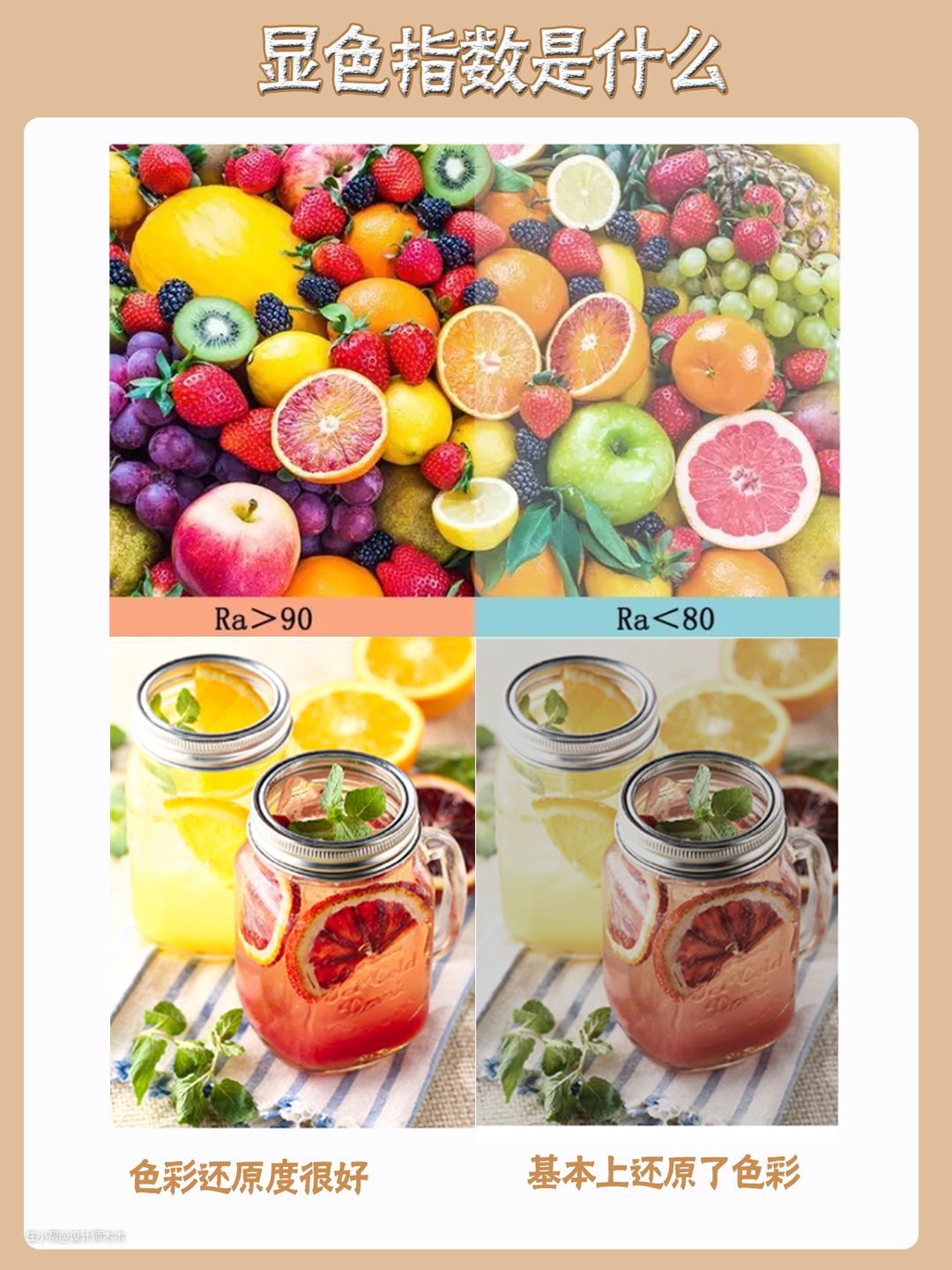 指的是对色彩的还原度,通常用Ra表示,指数越大显色性能越好,指数越低看起来就越失真。太阳光的显色指数定义为100,我们室内选择显色指数大于90的就好。