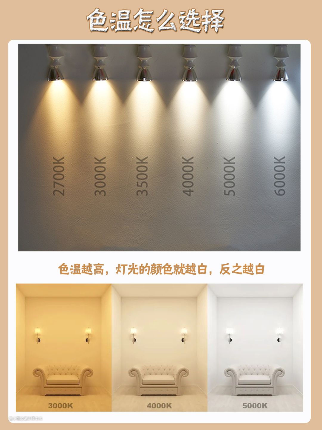 色温的单位是Kelvin,简称K。K值越高光线越白,反之越黄,家用的色温需要参考家里的装修风格和软装,我家是原木风,色温供打击参考一下。