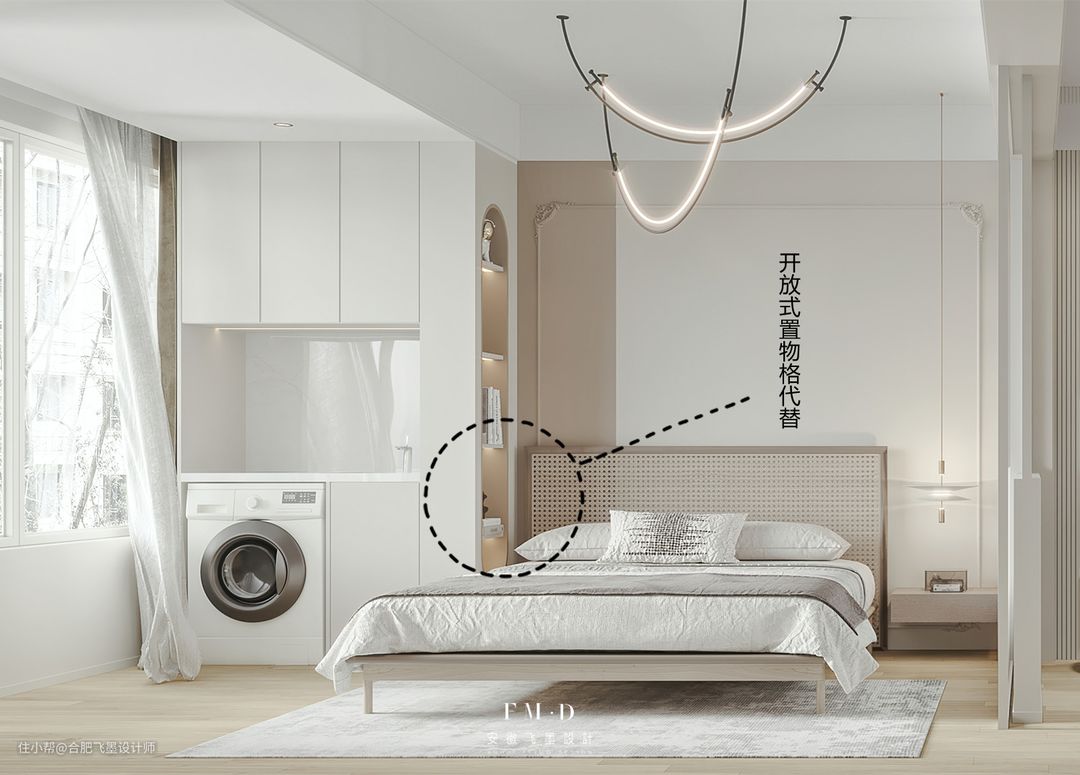 床头柜与衣柜在布局的时候要注意,如果距离太近,床头靠墙一侧衣柜可以做开放式置物格,这样解决与床头柜互相“打架”的问题;