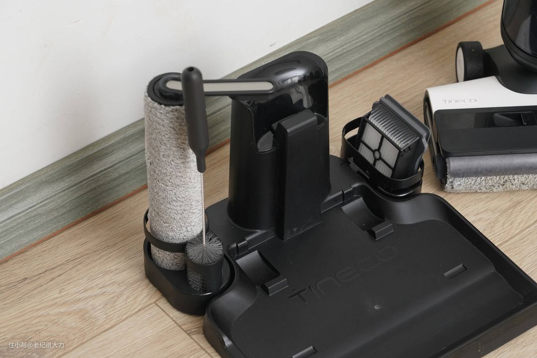 底座上可以摆上备用的水箱滤芯、刷子以及附带的第二枚滚刷,随用随取,还能加速湿润滚刷的干燥速度避免有异味和滋生细菌。