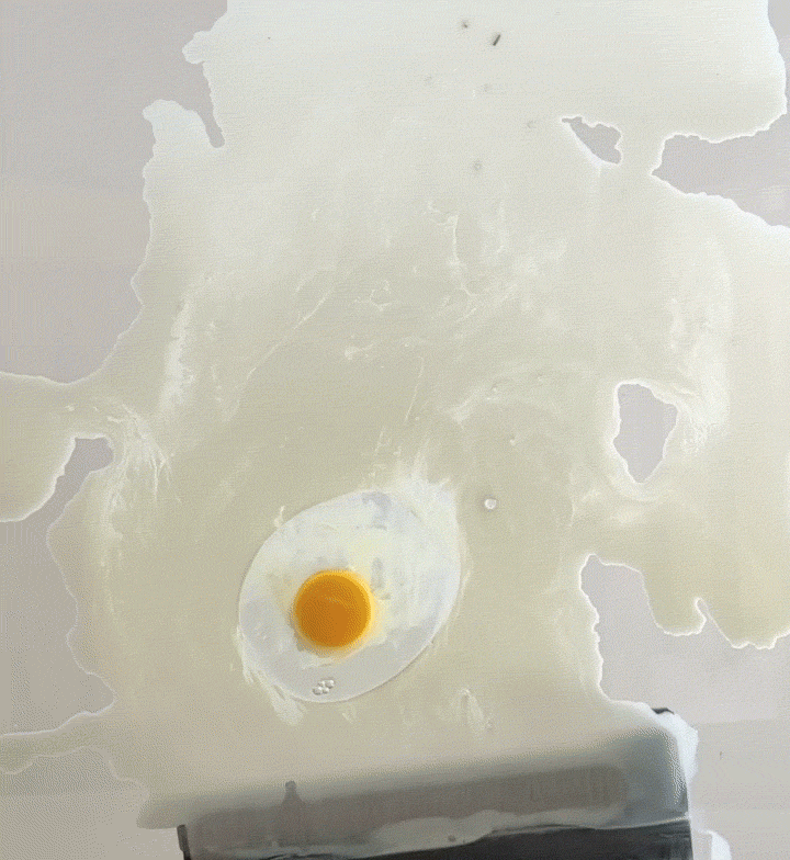 再来看看老纪从底部拍摄的洗地机工作画面,能看到在强大的吸力下,鸡蛋一下就被吸到滚刷然后抽进去了污水箱,两侧的牛奶即便是没直接接触到滚刷的部分,也被吸力从旁边吸了过来(注意看滚刷右侧那块黑色区域的牛奶)。