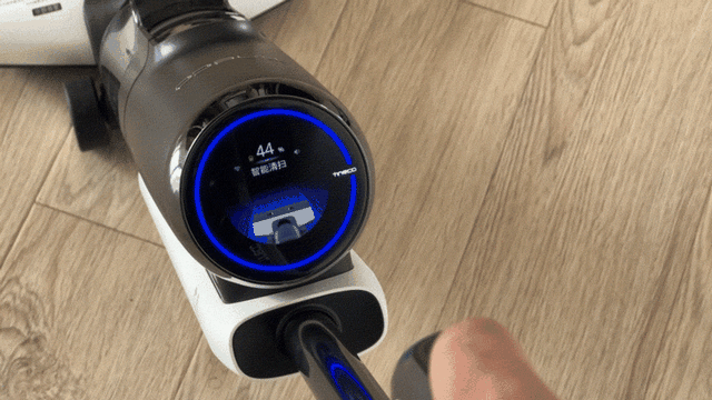 洗地机的把手有三个按钮,开关键旁边的是功能选择键,点按它可以在四种工作模式中切换,顶部的是自清洁按键,使用完洗地机放回底座充电后,按下自清洁键洗地机会自动涮洗滚刷以及清洁管道。