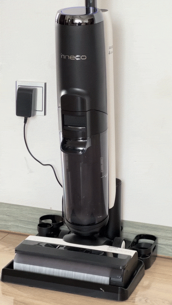 想要清洁洗地机,必须把洗地机放回底座,底座要通着电,这时按下手柄上的自清洁按钮就能启动自清洁模式啦!