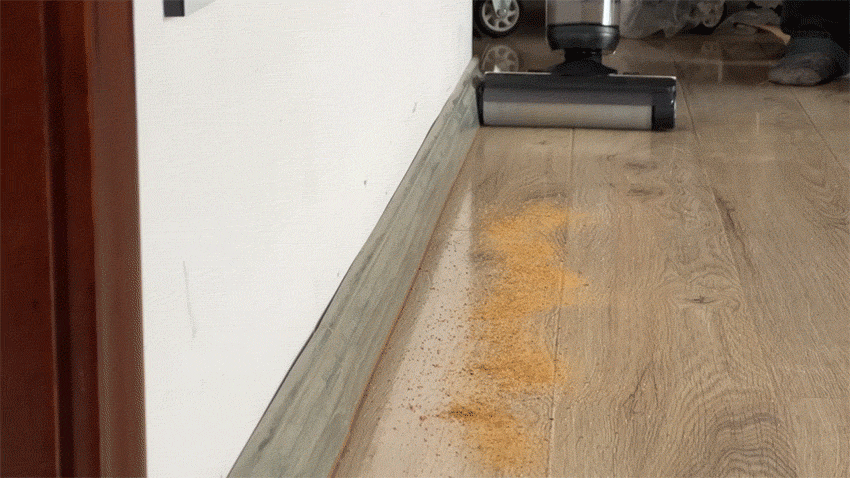 从使用中能感受到设计的用心,这款洗地机的右侧是无边的,可以几乎完全贴在踢脚线上,把地板边缘处不好清洁的灰尘全部一扫而空,不留死角。