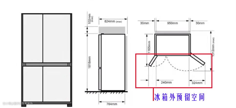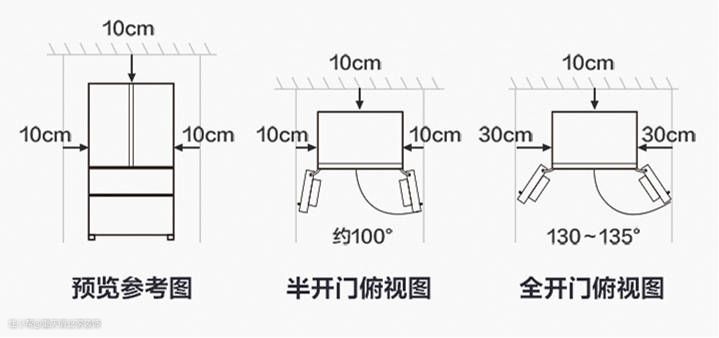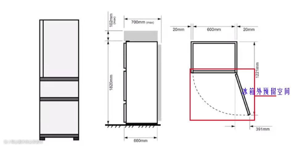 注意:普通的独立冰箱需预留的散热尺寸大概是左、右、顶以及背后各预留10厘米左右,如果是背面散热的款式,这种冰箱对左、右、顶部需预留的散热空间要求较小,一般只需预留2厘米即可。