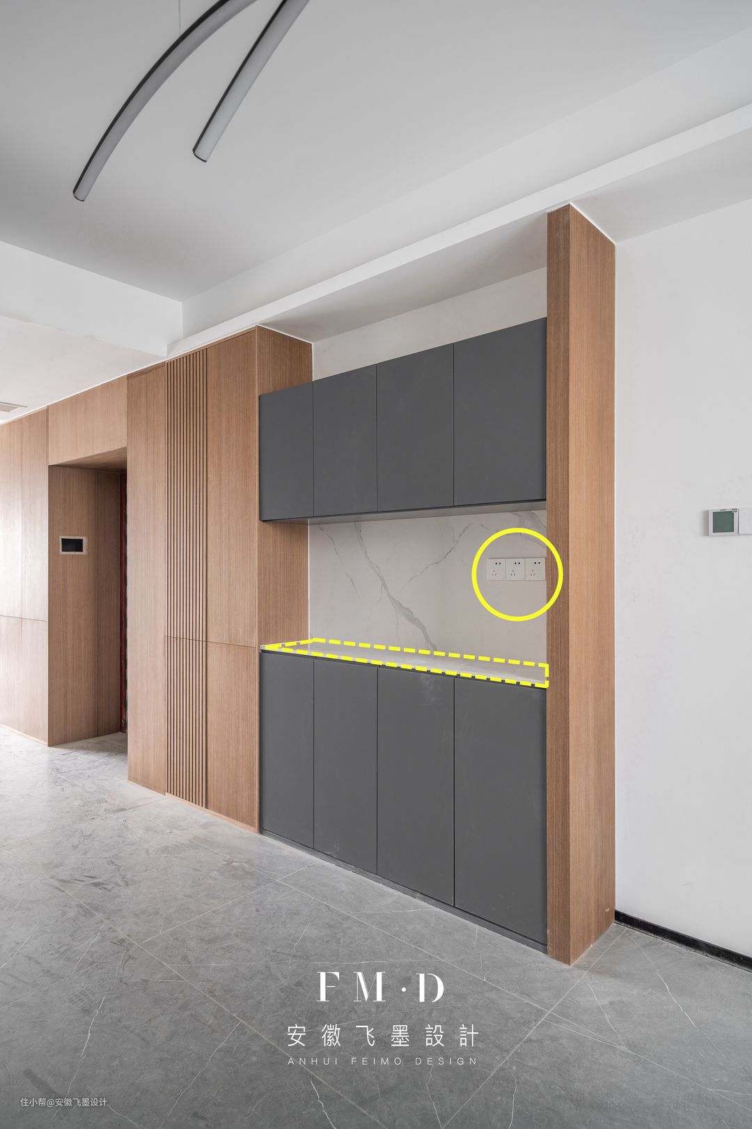 因为客餐厅直接做开放式处理,所以餐边柜是必不可少的存在,直接安排在玄关侧边空间,打造一个内嵌式的柜体。那么碗碟的基本存储空间就又有了,靠近餐桌空间,后期拿取物品也比较方便。3个小细节提醒一下大家: