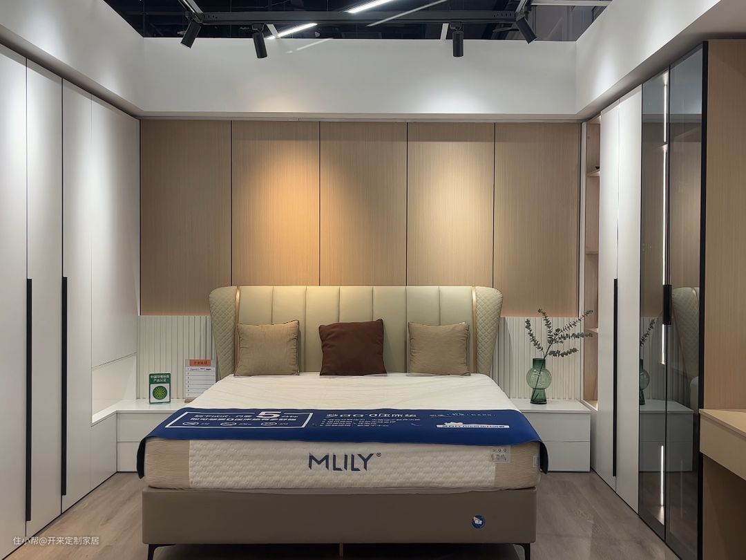 卧室装修更精致,一般将床头护墙床头柜、衣柜、书柜/梳妆柜一体设计,基本不落下。