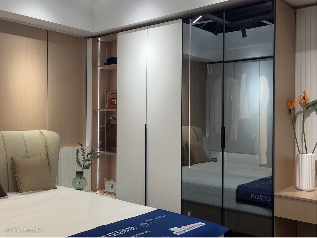 一面原木开架、简白高柜、镀膜玻璃柜(镜面)三结合,虚实收纳间整洁美观、大方有序;玻璃柜内挂放+叠放+抽屉设计,分类清晰;一字嵌入梳妆台,悬浮抽屉+格栅背景板,设计简约雅致。