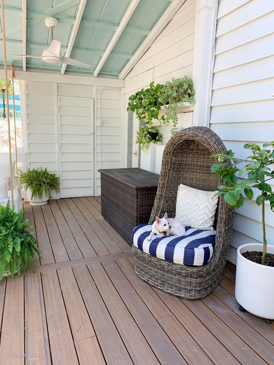 这里的装饰策略基本上是“植物和更多的植物”。它有助于在视觉上将门廊与我们房子周围的所有绿色植物连接起来——正如我们今天将向您展示的那样——它还有助于我们隐藏这个户外区域的一些不太漂亮的部分。让我们称它们为壁疣。三个大的长方形壁疣。但稍后会详细介绍。