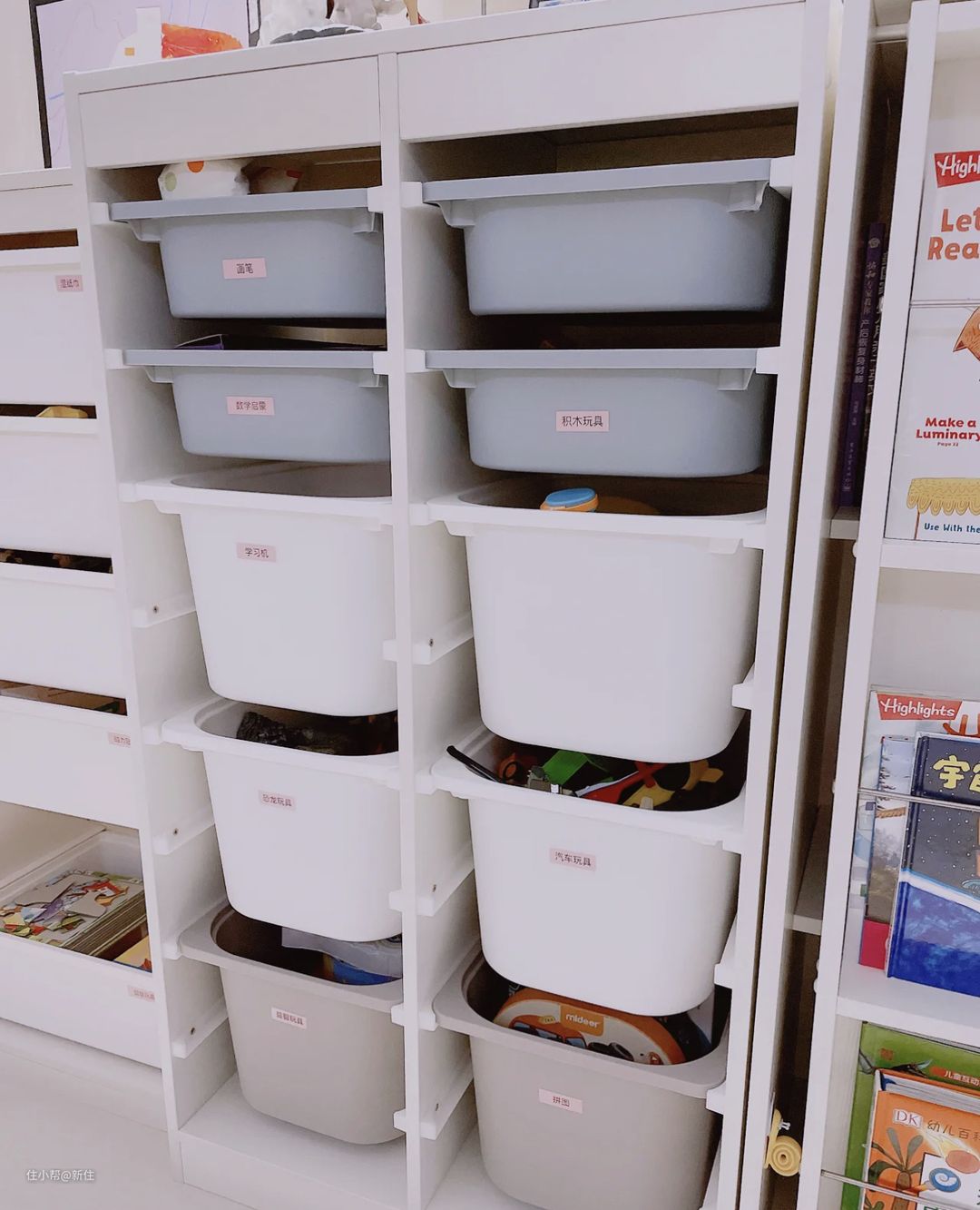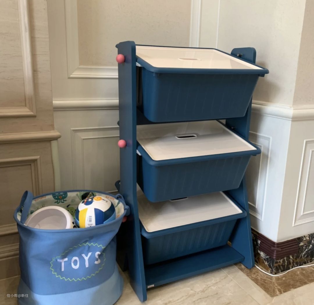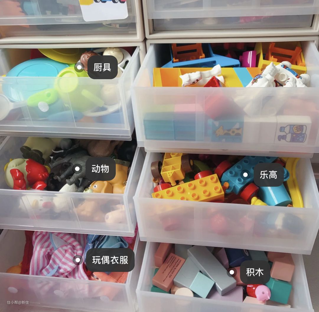 就拿取方便程度上来讲,目前这种抽拉盒子,算是最能平衡整洁美观度和拿取方便的方案。如果能利用起标签,给盒子分类,要找的玩具,便能迅速被找到。