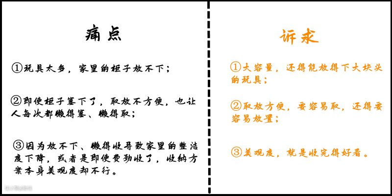由此痛点,我们反过来,其实就是玩具收纳的核心诉求: