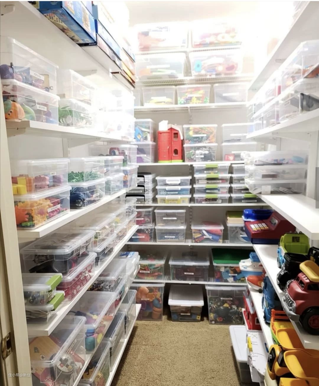 储物间,腾出来一部分收纳玩具,它是跳出我们前面讲的美观度、方便程度、容量的存在,根本不会存在其中任何一点问题,唯一比较难的是:家里得有。