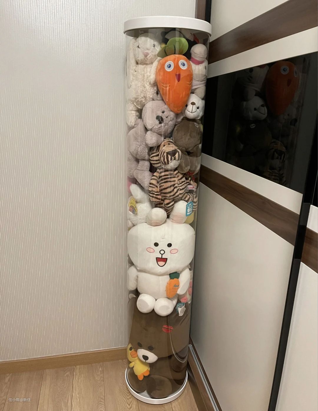 于是就出现下面这种专门针对娃娃收纳的透明娃娃收纳桶,非常火。