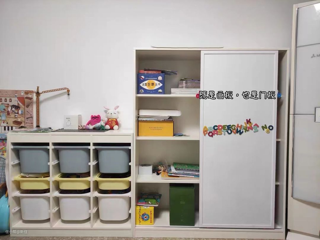 甚至还有,在收纳柜的门板上花心思,把门板做成了画板,还能让小孩在上面涂涂画画。