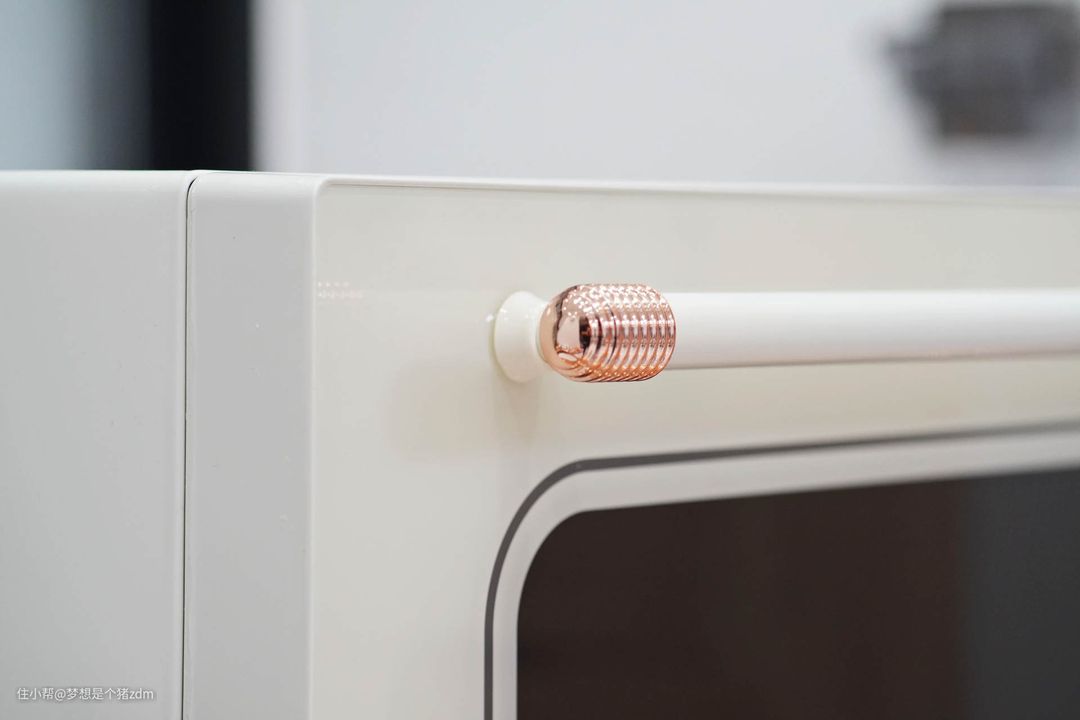除了蒸烤箱正面右下角的鎏金旋钮外,鎏金门把手也很好的呼应了这款机器的轻复古设计。