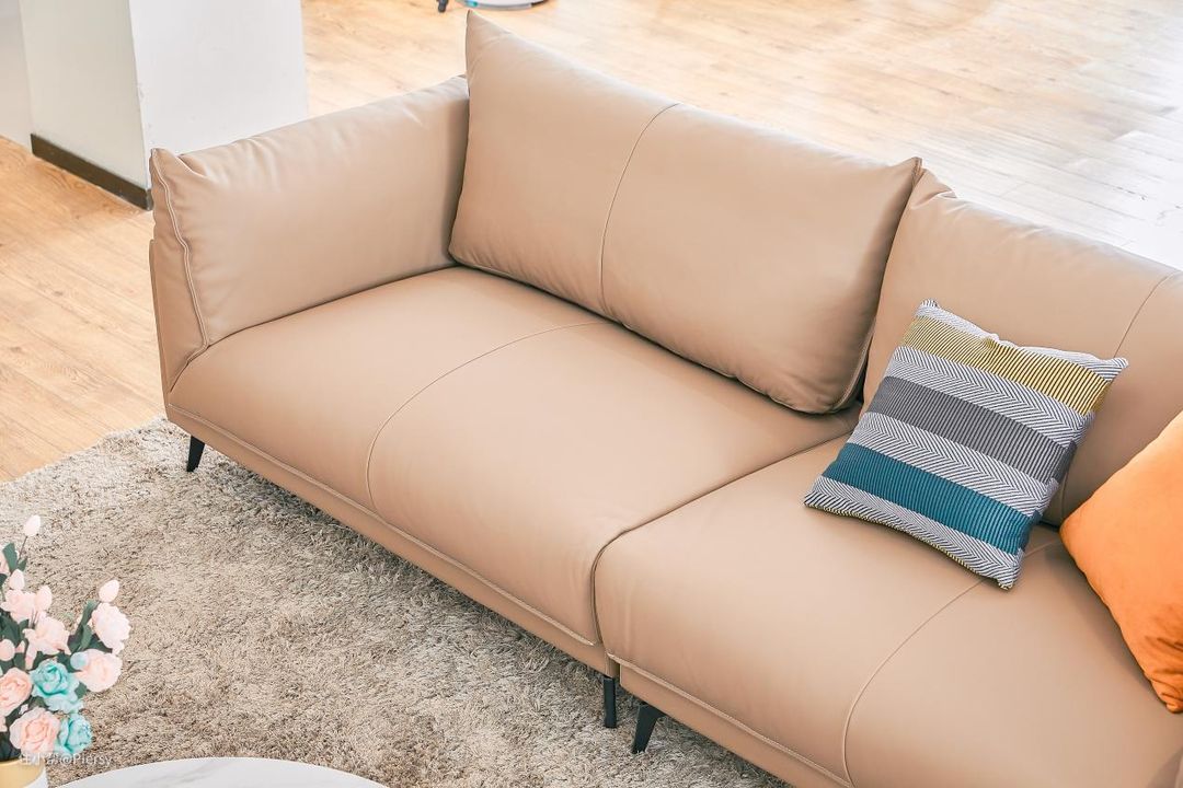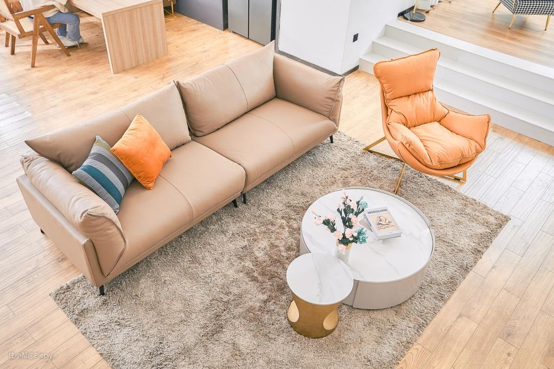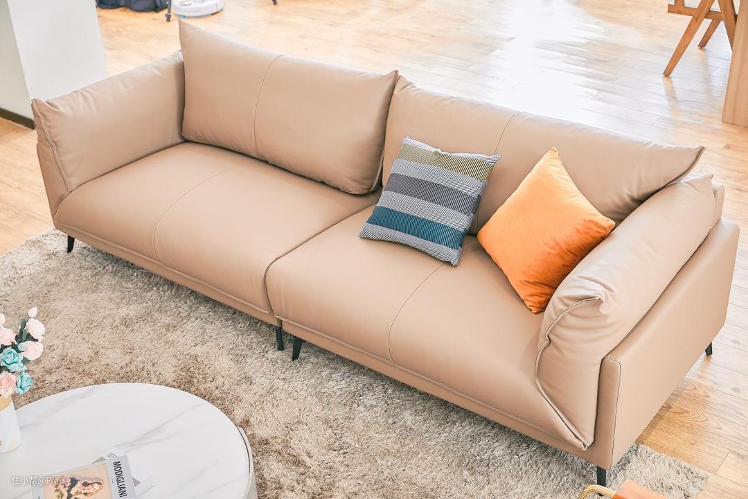 真皮沙发是月影家居的,这款沙发主打意式轻奢风, 造型简约流畅,颜色非常百搭 。沙发材质采用德国纳米科技布,手感柔软,触感舒适亲肤。除此之外,这款沙发的坐感也非常舒服,沙发坐包、靠包都使用羽绒海绵以及进行5cm填充,内部还有高弹海绵和高密度海绵,所以柔软不塌陷,坐享云朵般柔软,再加上沙发框架也是用的加厚俄罗斯松木,所以承重效果我是信得过的,底座和地面距离有13cm,扫地的时候扫把也能轻松进入。