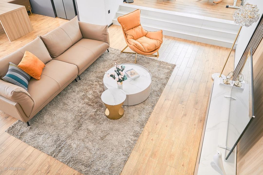 客厅最为重要的就是沙发,可以说是客厅的颜值担当了,所以在这个方面的选择我是最为用心的,特意选择了一款奶咖色的真皮沙发和一款亮橙色的摇摇椅,组合在一起真的是非常的搭配且好看。