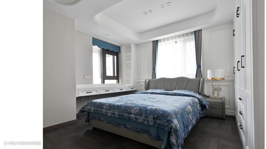 生活中最能让人放松的空间当属卧室,主卧采用了大面积的白色成衣柜,担当卧室的收纳需求。