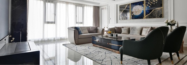 正对面散发着幽深光泽的深蓝色镜面组合装饰画搭配燕麦色的皮质沙发,一进门便给人眼前一亮的感觉,侧面两张单人墨蓝色法式宫廷沙发,结合金属玻璃茶几,使得空间的变化造型具有层次感和连续性。