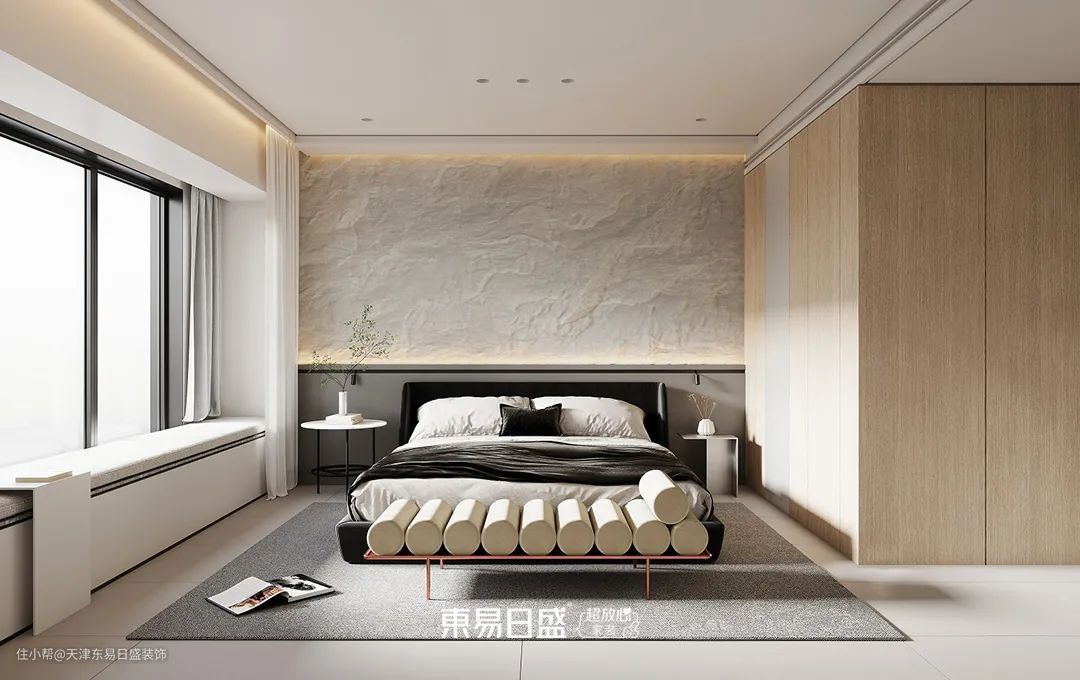 主卧摒弃了传统床头灯设计,通过磁吸轨道增加床头灯灵活性。床头从运用了PU石皮,在灯光的洗礼下,展示出狂放不羁的一面。