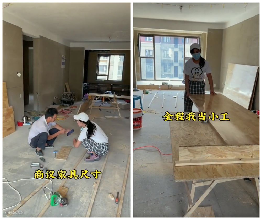 家里的家具是找了一位经验丰富的木工做的,为了省钱她全程打下手当小工,从测量家具尺寸到安装,还是挺辛苦的。