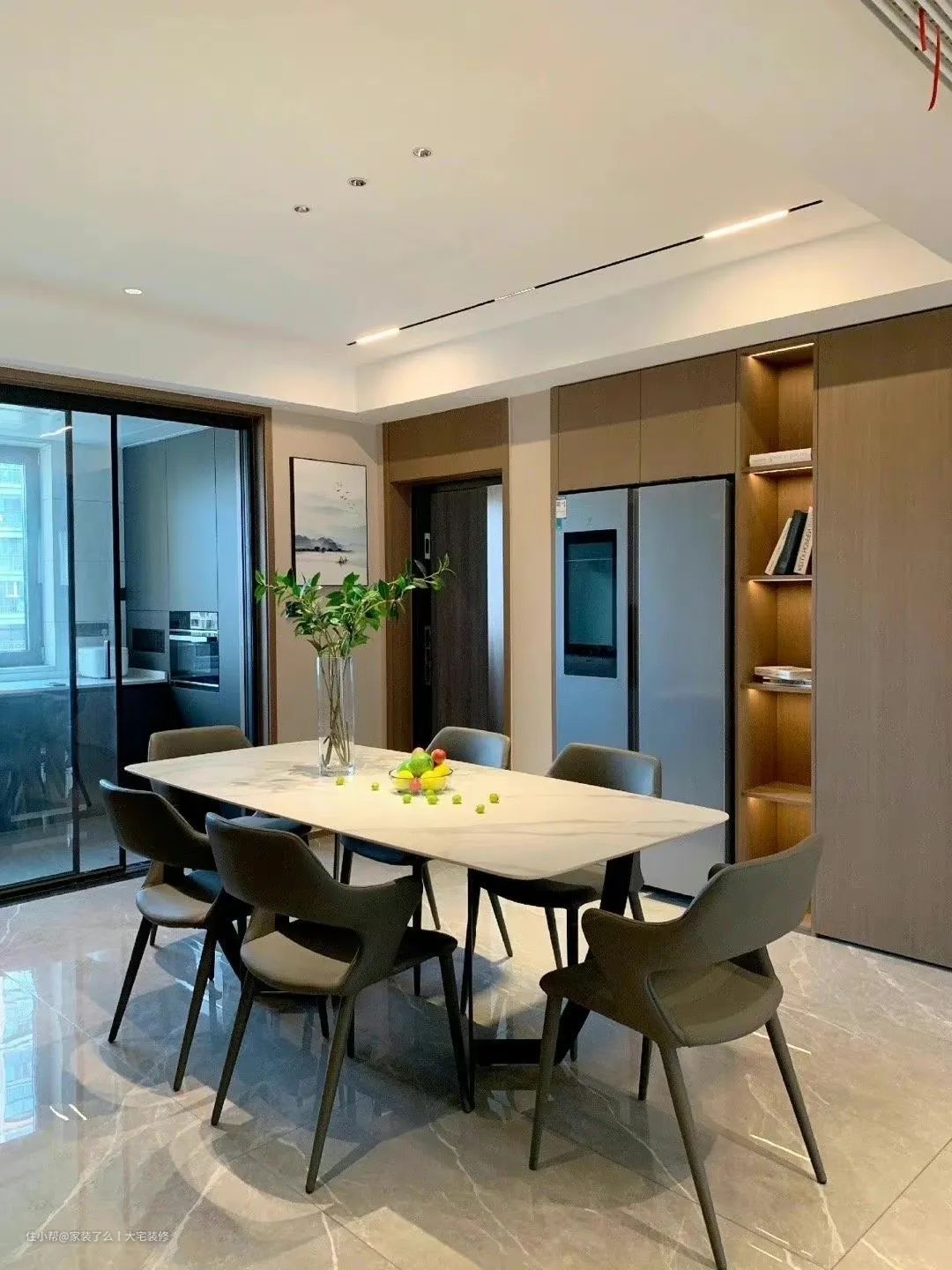 半开放式的现代简约餐厅,选了白色灰色为基调的色彩搭配,餐椅:皮质+复古木质让品质升华,还有奶油白色的大理石餐桌:是一条1. 4米的椭圆形长桌,白色的大理石面,干净又耐看,在这样的餐桌上吃饭,瞬间能提升食欲,墙上的装饰品非常应景。