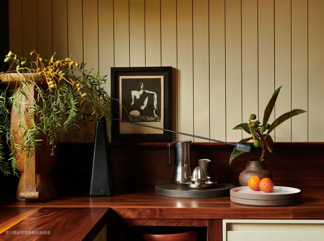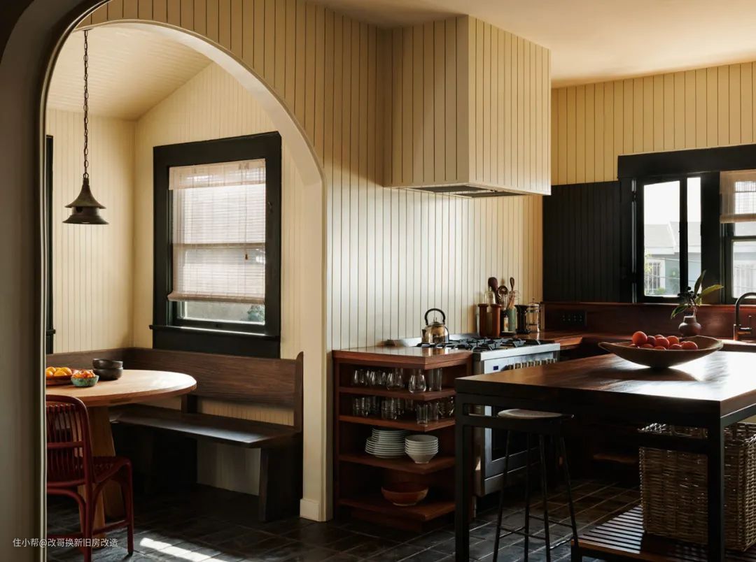 厨房主要采用了大面积的彩绘凹槽镶板和胡桃木台面。