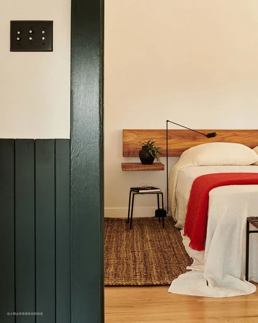 考虑到整体空间动线与私密性,设计师以不同的地板颜色区分不同的功能区。床头背景墙用了与楼下呼应的米白色做空间装饰色,横贴的木地板柔和卧室整体的舒适度。