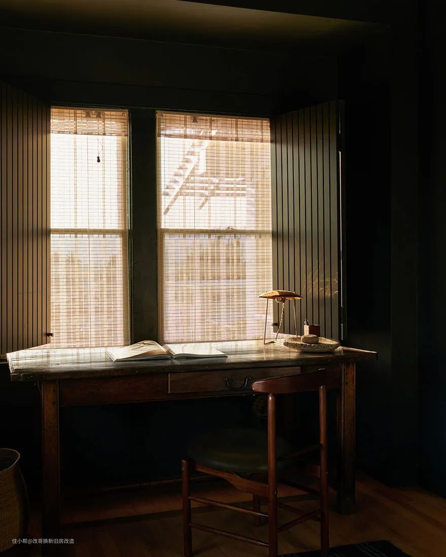 书房依旧沿用了彩绘凹槽镶板和胡桃木作为基调,桌头灯用了亮眼的暗黄色点缀森绿色的窗户,搭配白色的百叶窗,让空间不会因为大面积深色显得沉闷。