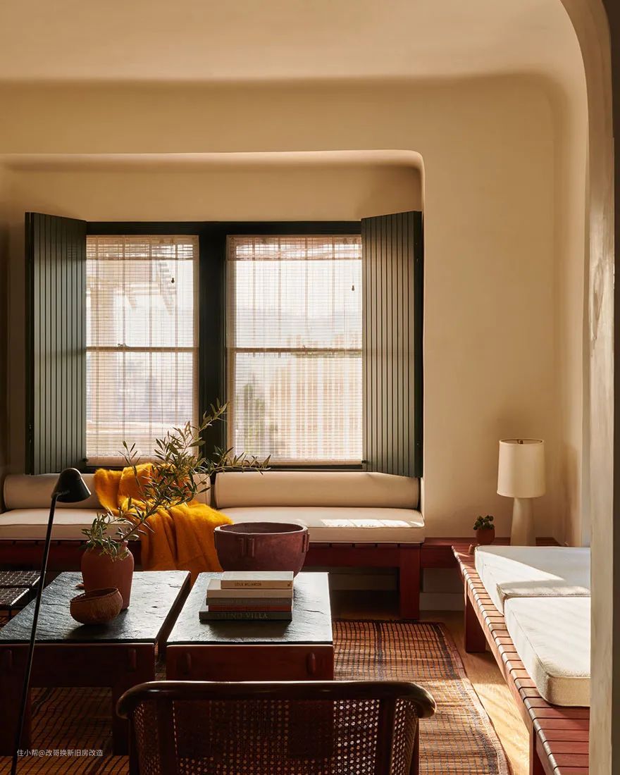 森系颜色的竖立条纹木窗与整个暖色空间的互补、碰撞,将客厅的亮度糅合得刚好,不会因为大面积的自然光,让空间显得过于明亮刺眼,使得整个空间的格调变得生动了起来。
