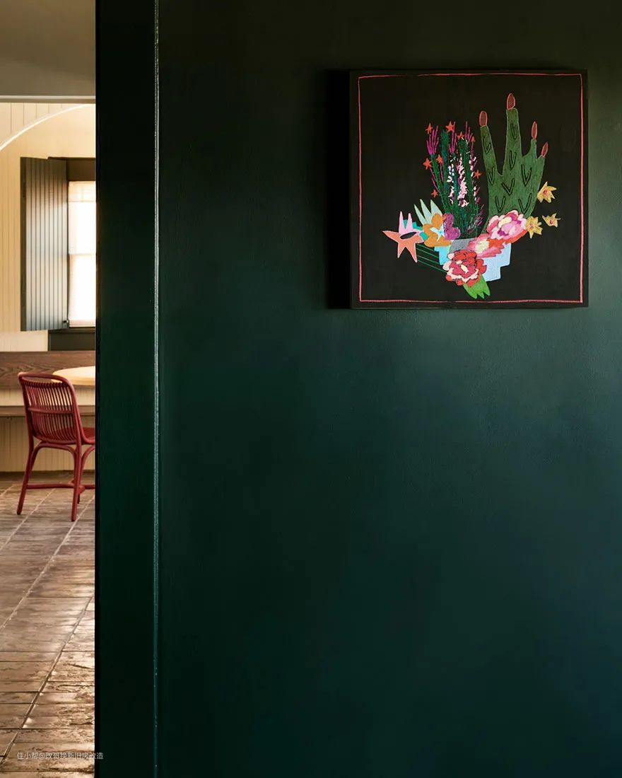 吊柜采用了和墙体一致的彩绘凹槽镶板,而橱柜门也做了跳色处理,使得氛围感活泼灵动了起来。