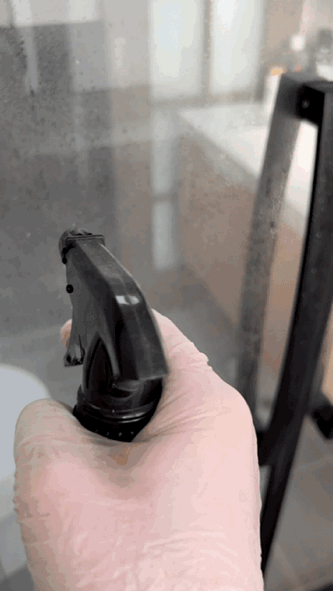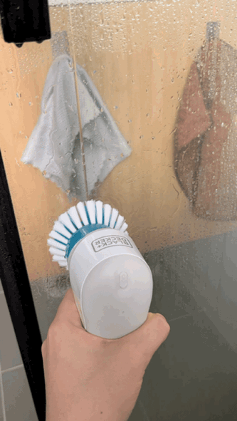 清洁的时候就直接开机像下图这样来回移动,有点类似抛光打磨的意思,下图是用得比较少的次卫沐浴间的玻璃,污垢不算特别多,移动的速度就可以快一点。同时有个小诀窍,因为刷头的设计是针对锅具的,会有一点弧度,所以清洁平面玻璃的时候可以将刷子往玻璃的方向稍用力压,这样刷毛贴合度会更好,清洁效果也更佳。