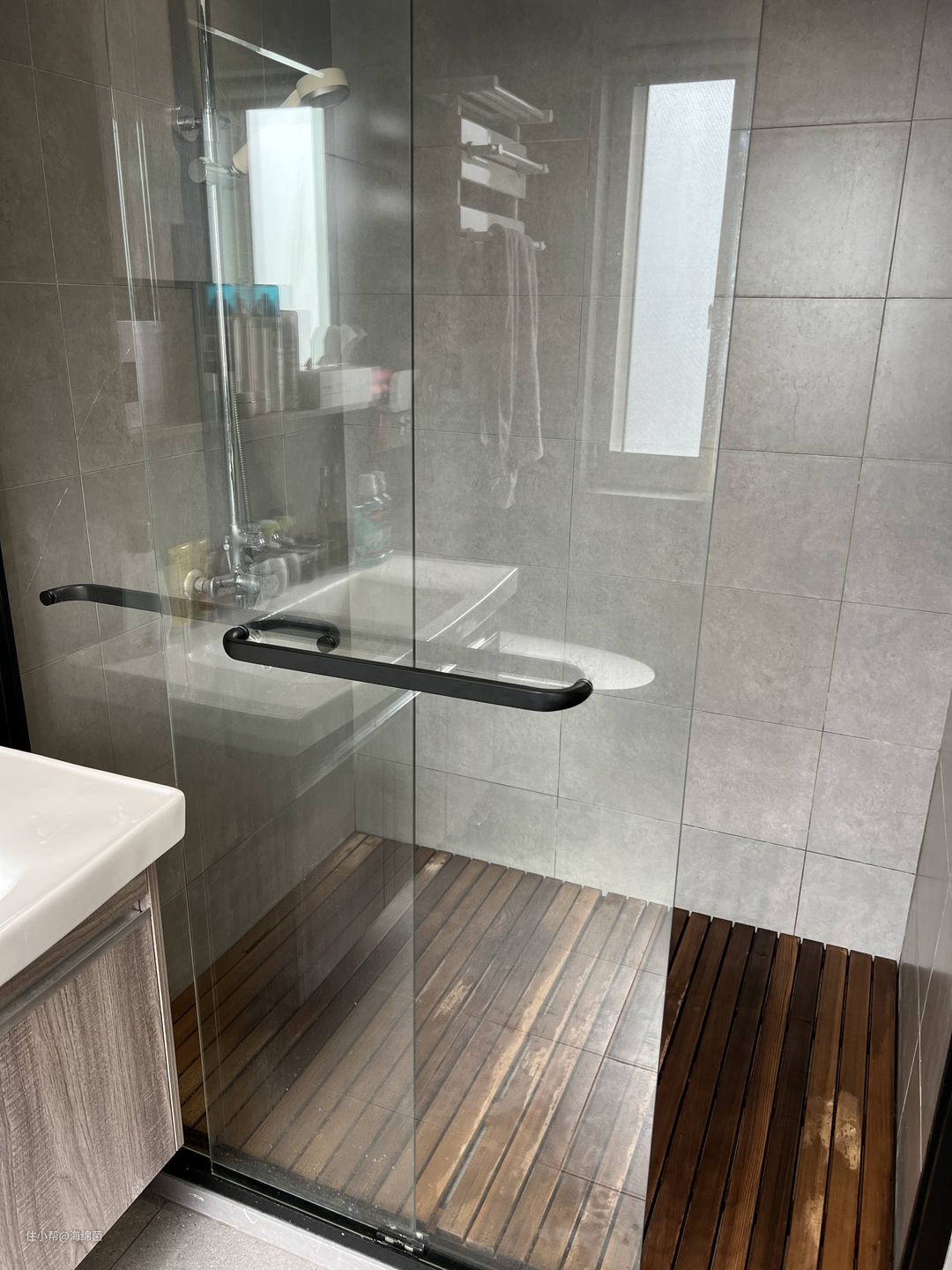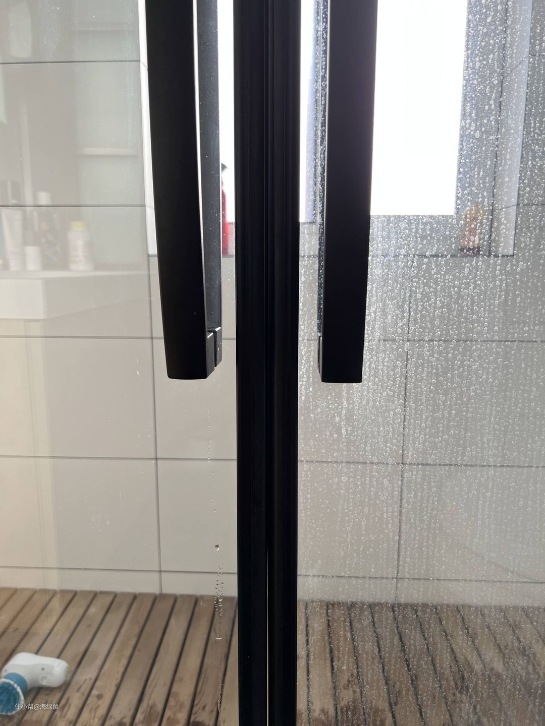再来一张更明显的,因为淋浴房是中开门的设计,所以打开时两边是有两块玻璃重叠的,拉开通风的时候等于两块玻璃上的污渍重叠到一起了,视觉上就显得更脏了。