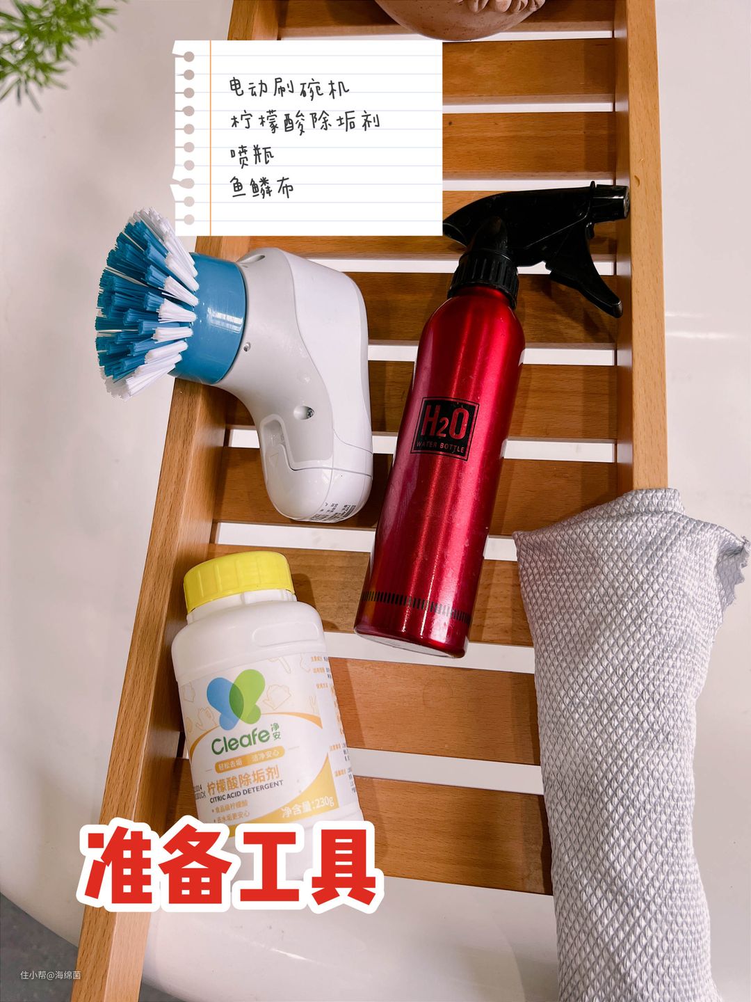 工具准备如下:一个电动洗碗刷,一个喷雾瓶,柠檬酸除垢剂,还有一块鱼鳞布。