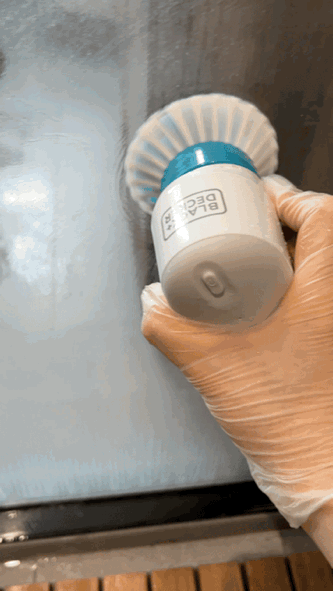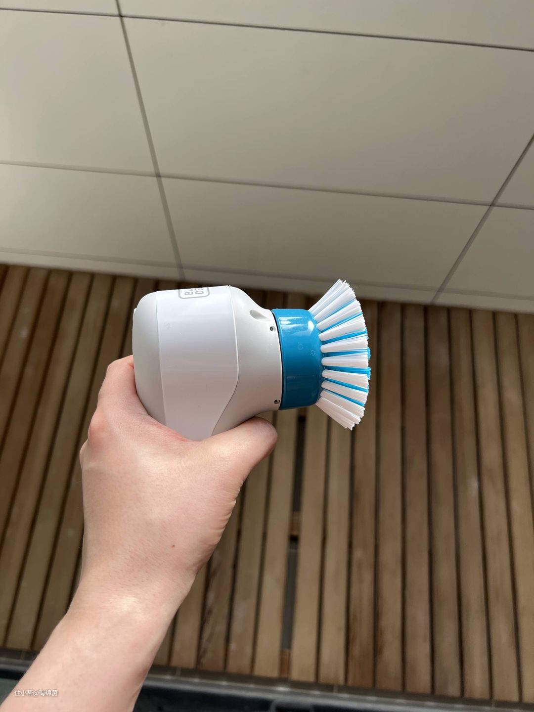 之后就可以用刷子开始清洁了,我用的是百得的电动洗碗刷,刷毛偏硬,清洁力不错。同时这款是装电池使用的,网上也能找到长柄的锂电池充电款。当然使用其他牌子的类似产品应该也是可以的,但那种洗脸刷是没有用的,因为刷毛太柔完全洗不干净,所以可以不用尝试了。