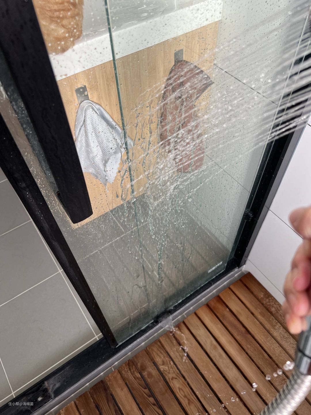 所以平时每次洗完澡都要做好日常冲洗,2个月左右在污垢还没有那么明显和顽固的时候做一下清洁,就会好打理很多。另外沐浴区的瓷砖表面如果也有积垢的情况,也可以这样操作解决。