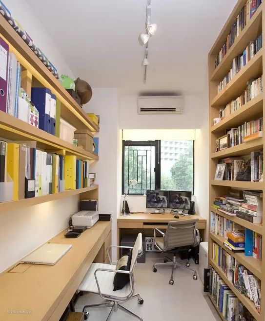 通常有一个中轴线,成左右对称。这个中轴线可以是柜体本身,也可以是一张书桌,这样的设计介于匀称设计与不规则设计之间,适合大多数人群。对称设计常在小空间中发挥优势,整齐舒适,又能更提高空间利用率。